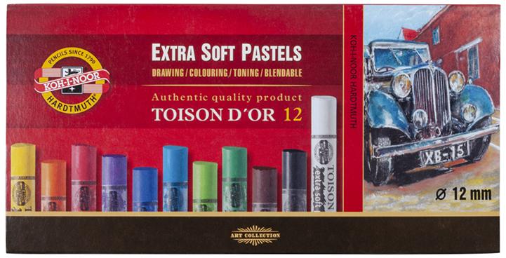 Pastele extra suche TOISON D’OR zostały wyprodukowane z najwyższej jakości składników. Do ich wyprodukowania został użyty bardzo trwały i jednolity pigment oraz bardzo drobno sproszkowane naturalne substancje na bazie węglanu wapnia, minerału kalcytu lub kredy. Są delikatniejsze od standardowych pasteli suchych, zdecydowanie łatwiej się rozcierają. Charakteryzuje je duża sypkość. Dzięki większej średnicy (12 mm) niż w przypadku standardowych pasteli; świetnie nadają się do kolorowania dużych obszarów i prac w dużym formacie. – Profesjonalne grube ekstra suche pastele Toison D’or – Zestaw zawiera 12 kolorów w kartonowym opakowaniu – Są delikatniejsze niż standardowe pastele suche – Bardzo dobrze przylegają do podłoża i łatwo się rozcierają – Ze względu na rozmiar jumbo nadają się do dużych powierzchni i prac w dużych formatach