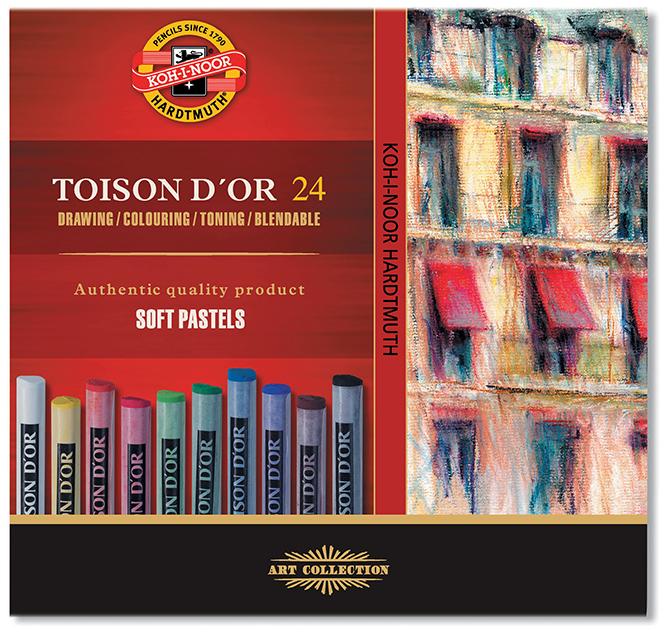 Pastele suche TOISON D’OR zostały wyprodukowane z najwyższej jakości składników. Do ich wyprodukowania został użyty bardzo trwały i jednolity pigment oraz bardzo drobno sproszkowane naturalne substancje na bazie węglanu wapnia, minerału kalcytu lub kredy. Są bardzo delikatne, dzięki czemu świetnie się rozcierają. Do rysowania pastelami zaleca się używać papieru z fakturą, gdyż łączą się one z podłożem tylko w sposób mechaniczny. Po zakończeniu pracę należy zabezpieczyć fiksatywą, zapobiega to dalszemu rozmazywaniu się pracy. – Pastele suche z serii Toison D’or 8500 Zestaw zawiera 24 kolory w kartonowym pudełku – Każdy pastel posiada numeryczne oznaczenie koloru co ułatwia identyfikację – Odznaczają się bardzo szeroką paletą trwałych kolorów i jednolitą strukturą w masie pasteli – Są bardzo kruche i delikatne, dzięki czemu dobrze się rozcierają – Pastele bardzo dobrze przylegają do podłoża – Prace po zakończeniu należy zabezpieczyć przez pokrycie fiksatywą