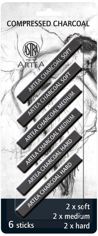 Zestaw węgli prasowanych Astra Artea 6 sztuk blister, 2 medium, 2 hard, 2 soft – czarny • miękki i naturalny • do rysowania i szkicowania na różnych powierzchniach • dostępny w dwóch różnych średnicach 6-8 mm oraz 3-6 mm • prace należy zabezpieczyć fiksatywą